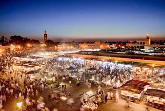 La Place Jemaa el-Fna, est le coeur animé de la ville, célèbre pour ses stands de restauration, ses charmeurs de serpents, et autres acrobates ou musiciens.