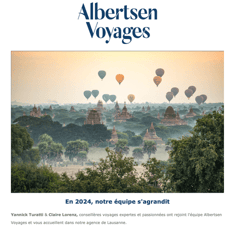 En vous abonnant à notre newsletter, vous recevrez régulièrement par e-mail les dernières nouvelles de notre agence spécialisée dans les voyages sur mesure, ainsi que nos offres du moment et nos inspirations vacances.