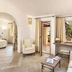 Les 121 chambres et Suites raffinées de l'hôtel sont joliment décorées dans le style méditerranéen. L’ameublement intérieur met en valeur les matériaux locaux, les couleurs renvoient à l’azur et au vert changeant de la mer de Sardaigne. Elles disposent d’une terrasse équipée avec une table et des chaises, une salle de bain avec douche et sèche-cheveux, air conditionné, téléphone, TV, coffre-fort, minibar, peignoirs pour les adultes et serviettes de plage.