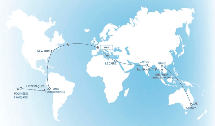 Les Etats-Unis, le Pérou, L'Île de Pâques, la Polynésie française, l'Australie, le Vietnam, le Cambodge, l'Inde et l'Egypte seront les étapes de ce merveilleux voyage.